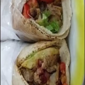 Pão sírio, molho de alho, carne, tomate, cebola roxa, alface e batata frita.