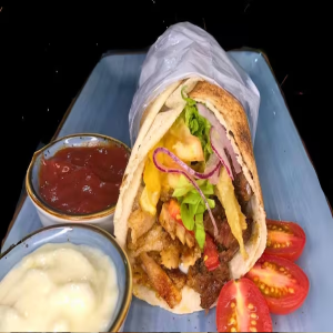 Pão sírio, molho de alho, carne, frango, tomate, cebola roxa, alface e batata frita.