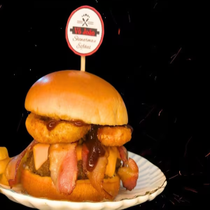 Pão brioche, hambúrguer bovino 150g, queijo cheddar, bacon fatiado, anel de cebola, barbecue e molho especial.